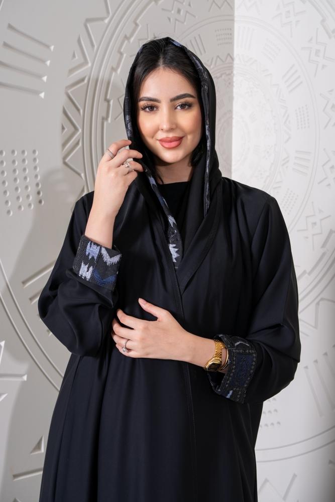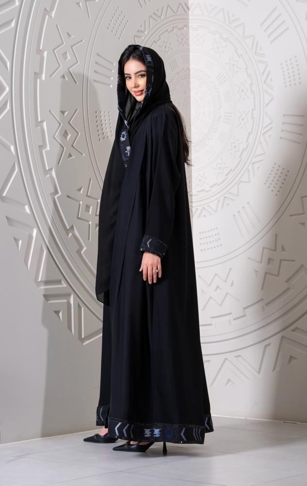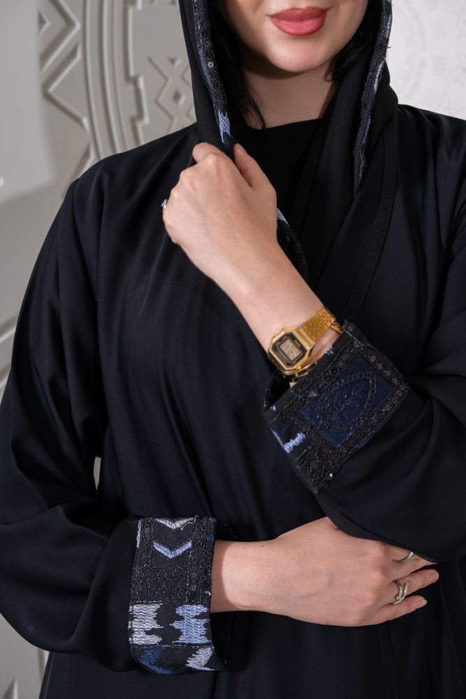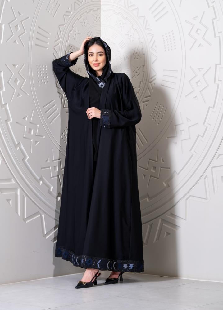عباية فخمة بتفاصيل تطريز راقية تجمع بين البساطة والأناقة في كل خيط. تصميم أسود كلاسيكي مزين بتطريز كحلي ناعم على الأكمام والحافة السفلية، يمنحها لمسة فنية تلفت الأنظار دون مبالغة.