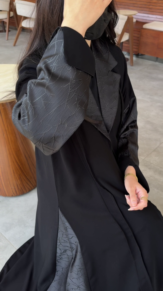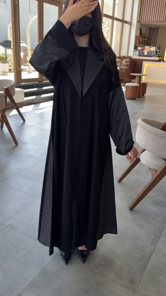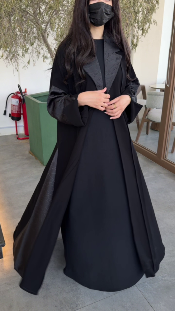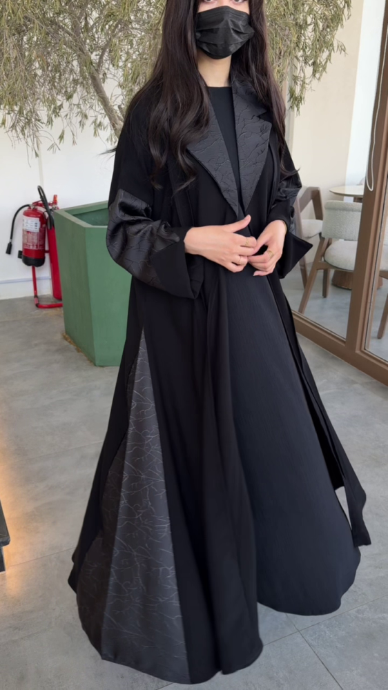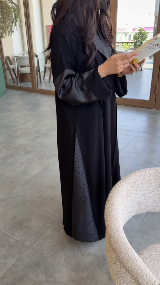 ارتقي بأناقتك مع هذه العباية السوداء المصممة بأسلوب كلوش أنيق، بتفاصيل ساتان منقوش فاخر على الأكمام والياقة وجوانب العباية، تمنحك فخامة فريدة في كل خطوة.