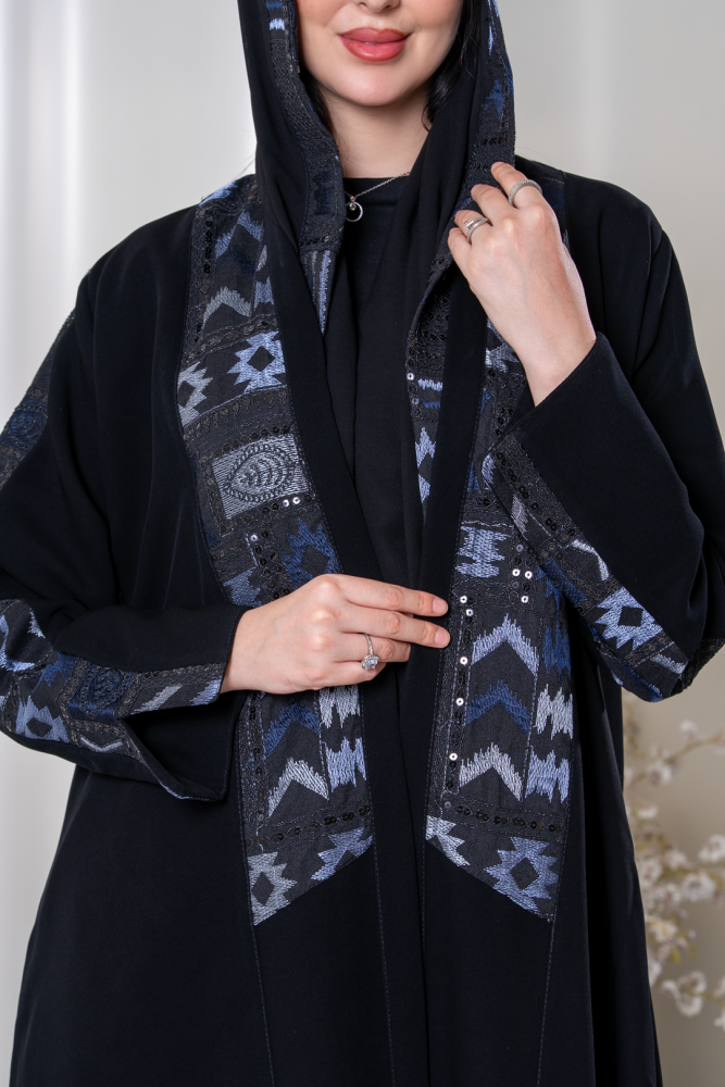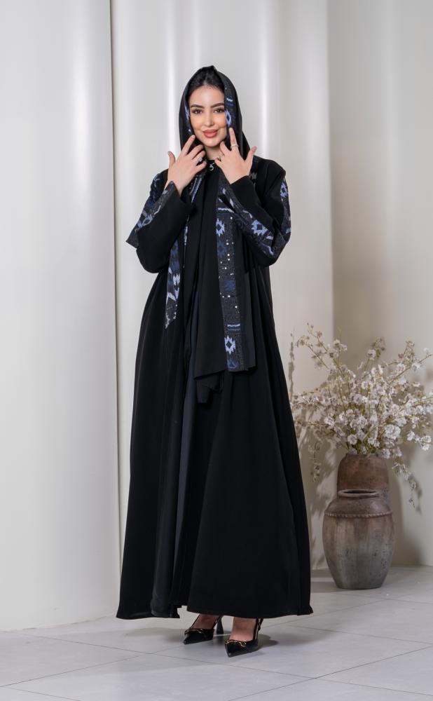 عباية فاخرة تجمع بين الأصالة واللمسة العصرية، بتصميم أسود أنيق يزينه تطريز هندسي بألوان ساحرة تمنحها طابعًا راقيًا ومميزًا.