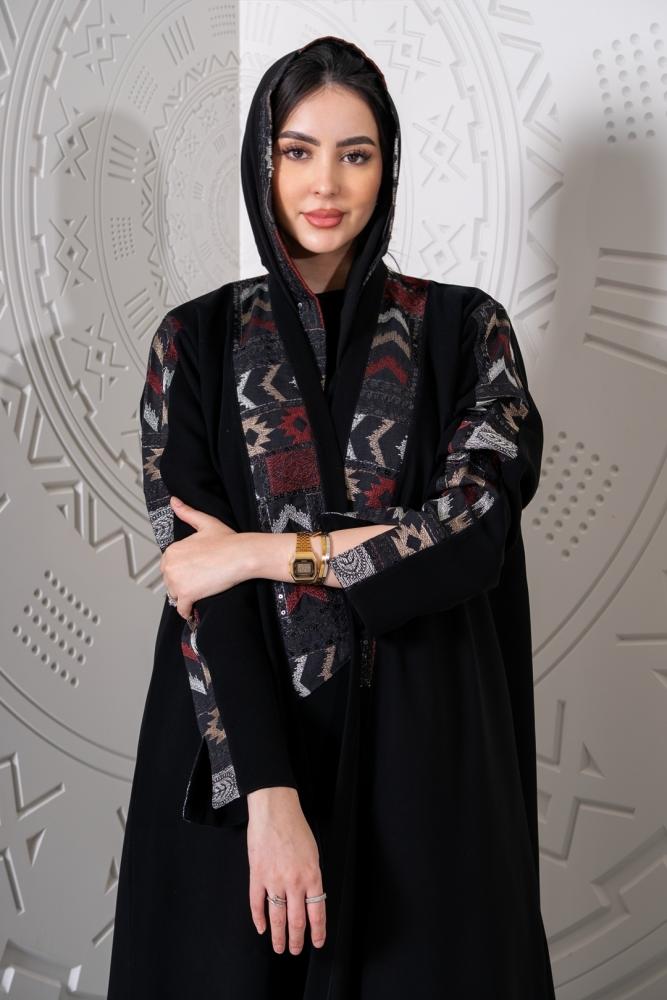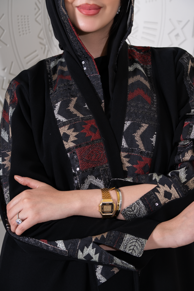 عباية فاخرة تجمع بين الأصالة واللمسة العصرية، بتصميم أسود أنيق يزينه تطريز هندسي بألوان دافئة تمنحها طابعًا راقيًا ومميزًا.