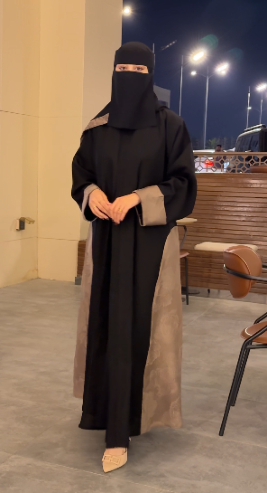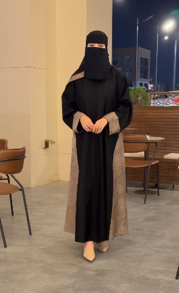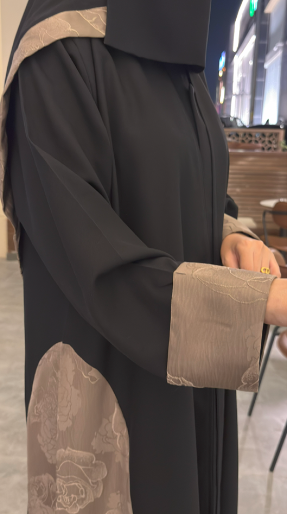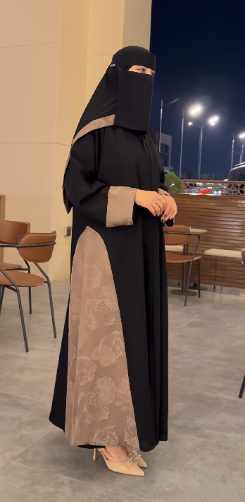 تصميم راقٍ يجمع بين فخامة الأسود ودفء اللون البيج بنقوش وردية ناعمة تمنحك إطلالة أنثوية مفعمة بالرقي.