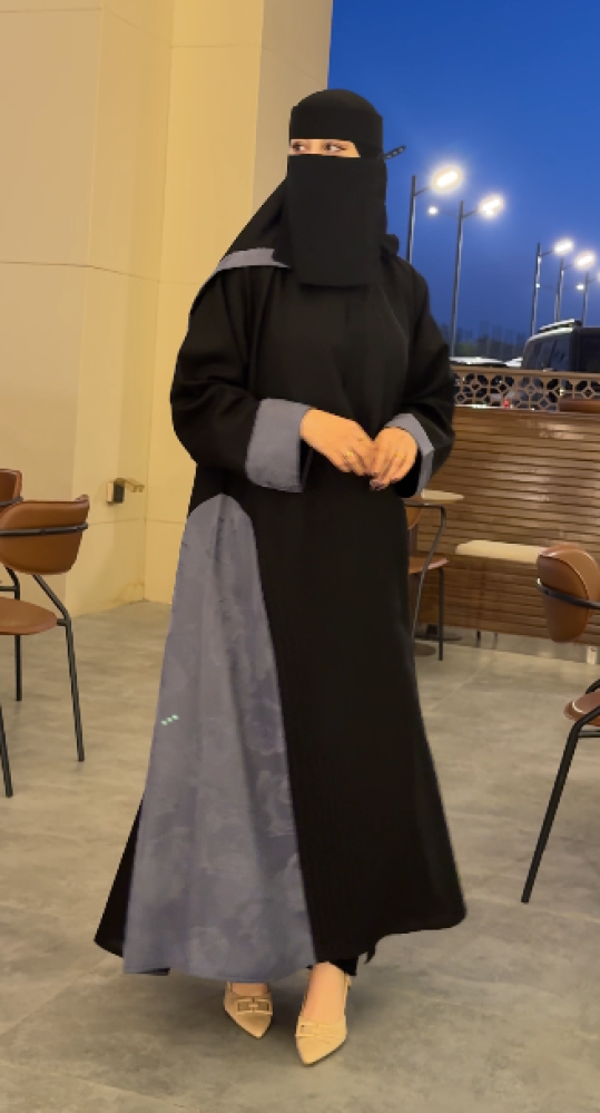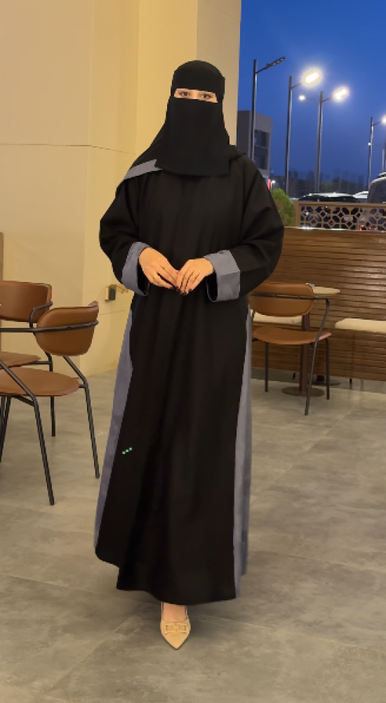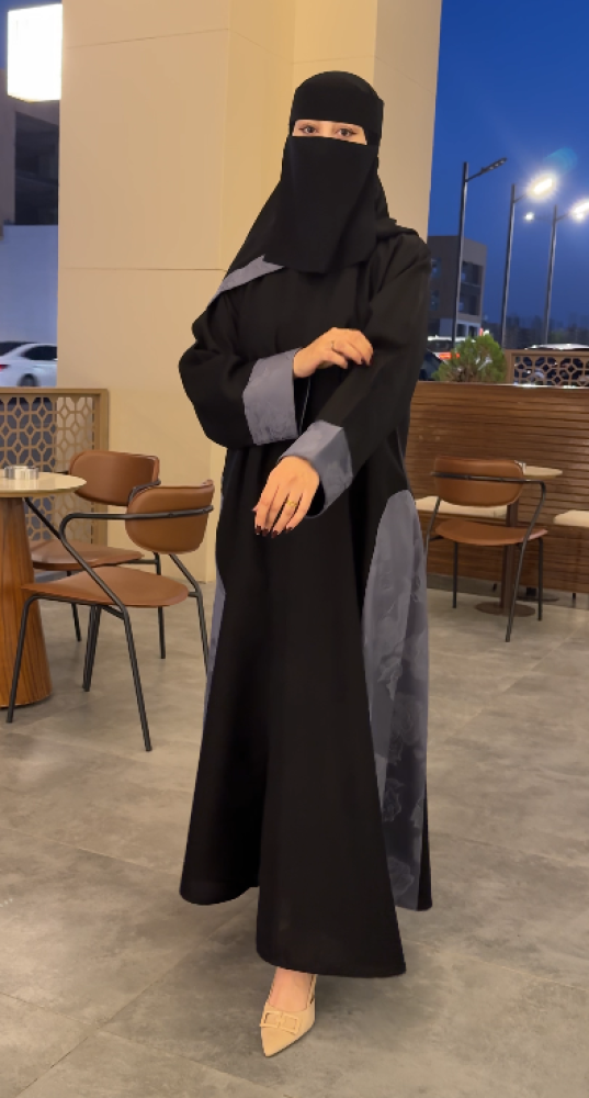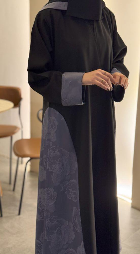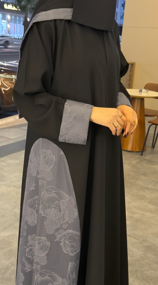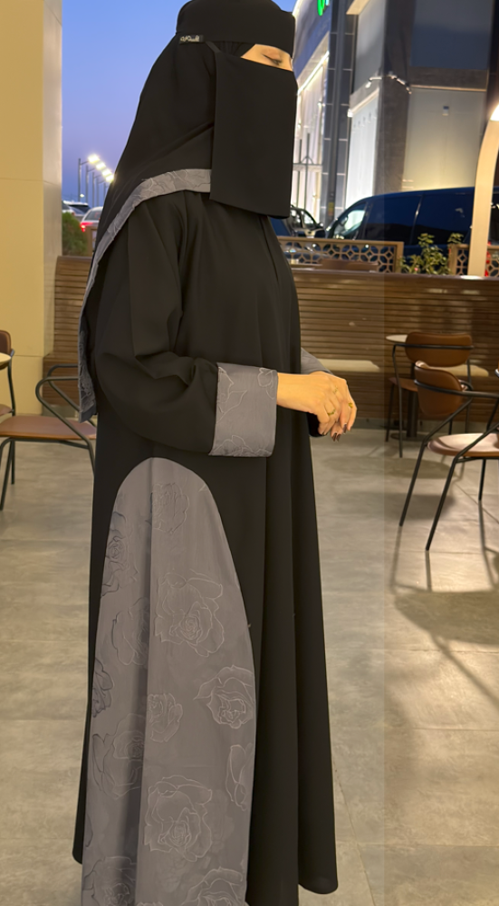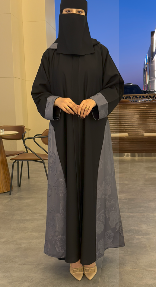 تتميز العباية بتصميم واسع وانسيابي يمنحك حضورًا مهيبًا وأناقة لا تُضاهى، مع أكمام مزدانة بتفاصيل رمادية فريدة تضيف توازنًا راقيًا للتصميم.
