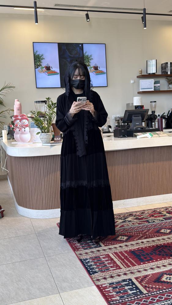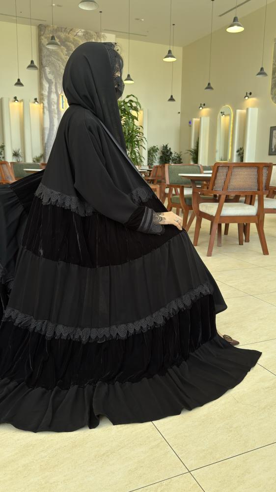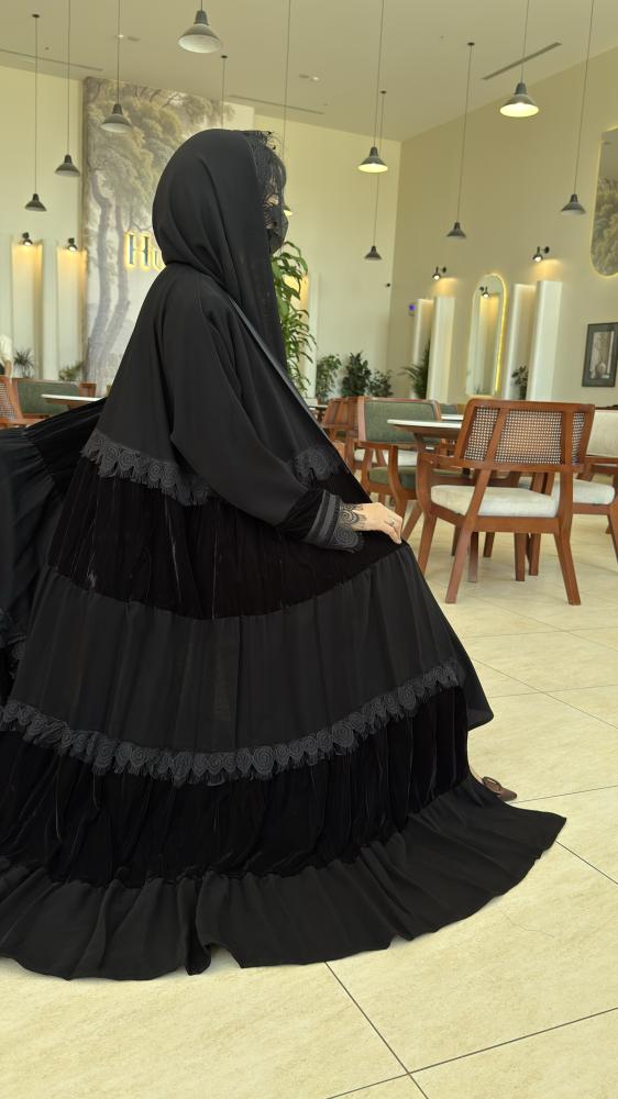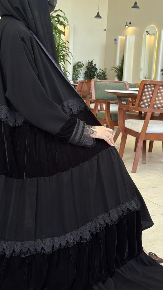 تأتي العباية بقماش مخمل فاخر يتدرج بأسلوب طبقات أنيق يضفي لمعة راقية وفخامة تلفت الأنظار، مع لمسات دانتيل ناعمة على الأكمام وحواف الطبقات لتكتمل تفاصيل الرفاهية.