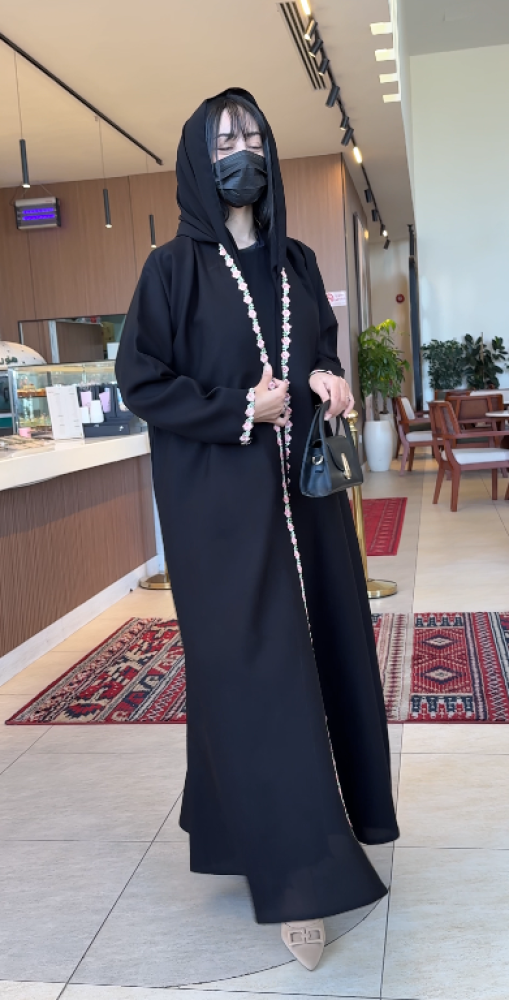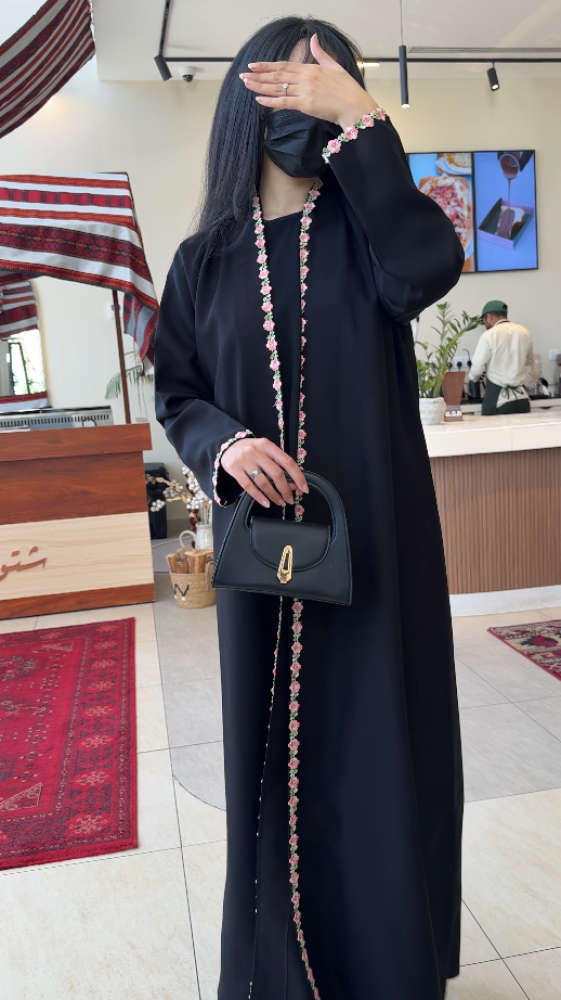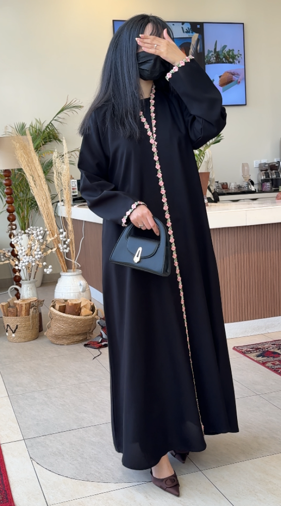 عباية سوداء كلاسكية بتصميم ناعم جداً، تبرز جمالها التطريزات الوردية الممتدة على الواجهة والأكمام، لتمنحك إطلالة أنثوية ملفتة بطريقة راقية وغير مبالغ فيها.
