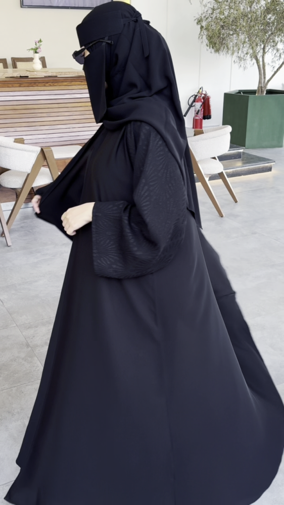 عباية تعكس رُقي التفاصيل وبساطة التصميم، بلمسة ناعمة وراقية تليق بذوقك الفريد. تميّزت هذه العباية بأكمام منسوجة برسومات خفيفة توحي بالنعومة والانسيابية، مما يجعلها خيارًا مثاليًا للمرأة الراقية التي تبحث عن التفرّد دون صخب.