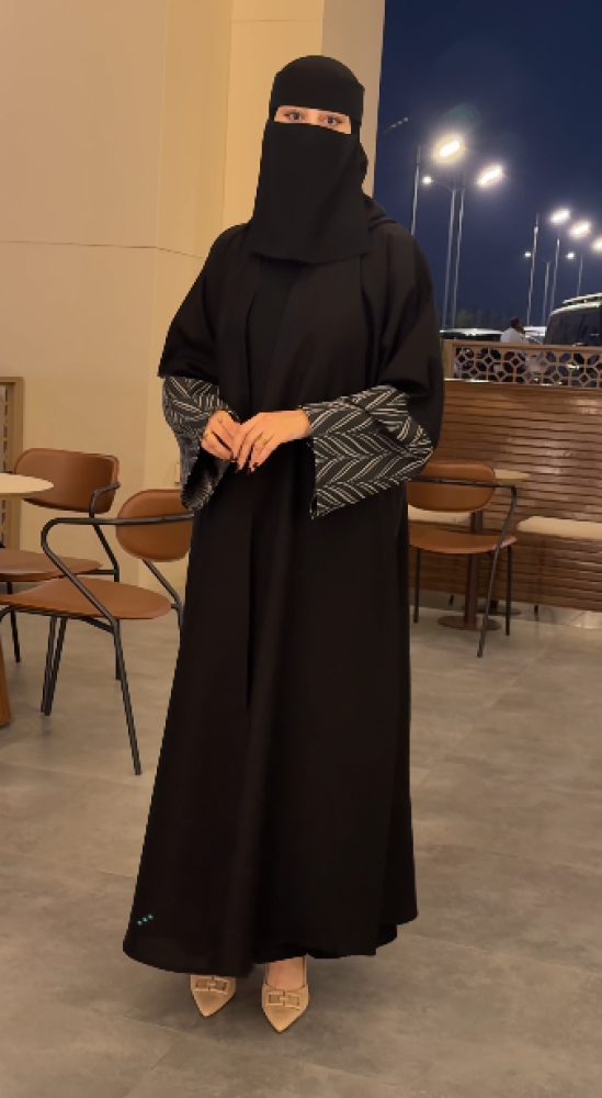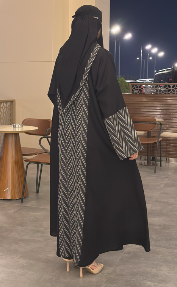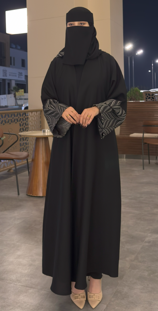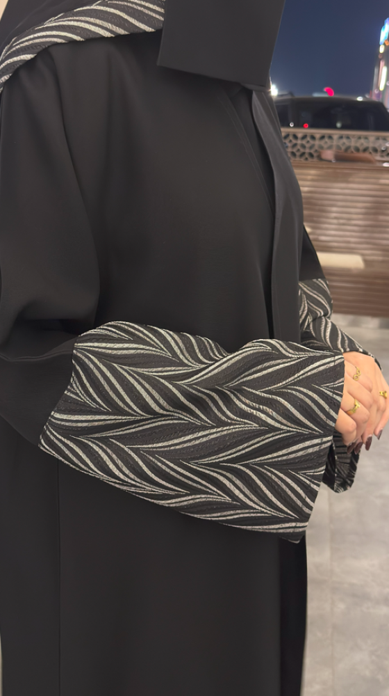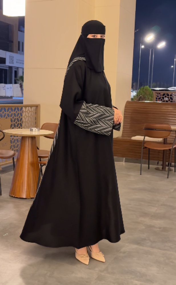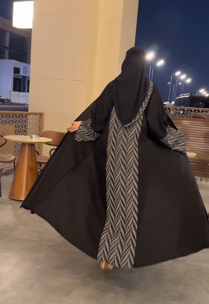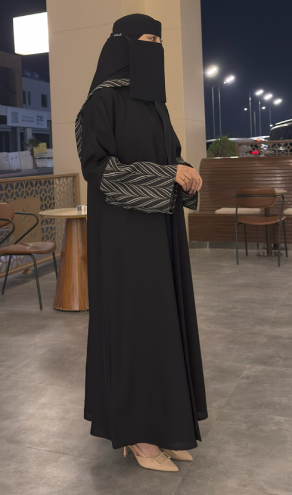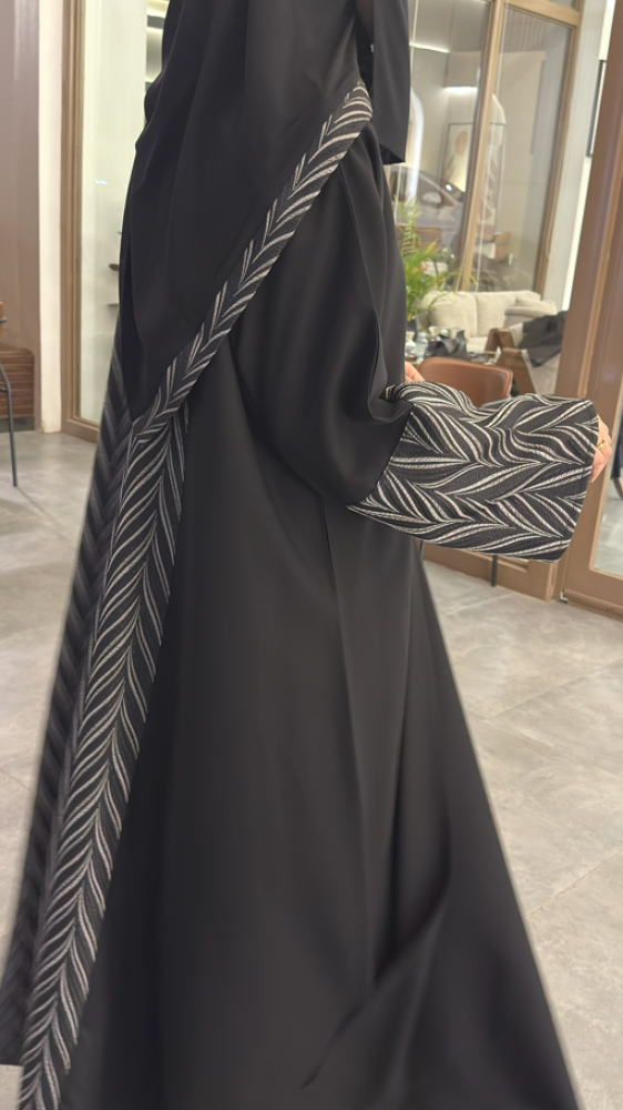 تألّقي بإطلالة راقية تجمع بين الهدوء والفخامة مع هذه العباية السوداء الفاخرة التي تميّزت بتفاصيلها التطريزية الساحرة على الأكمام والجهة الخلفية. النقشة الهندسية بخيوط لامعة تمنح العباية طابعاً عصرياً متفرّداً يعكس ذوق المرأة الأنيقة التي تبحث عن التميّز في كل تفصيلة.